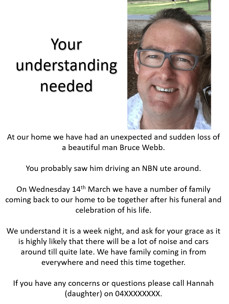 So I created some flyers that gave people around us the heads up that there was going to be some noise, and cars and people around after the funeral.