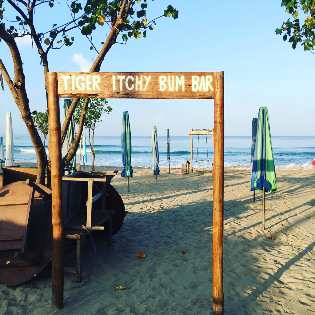 I decide to mix it up a bit and head a different direction. Rather than head up towards Seminyak, I go toward Kuta a little along the walkway and a little along the beach. It’s so nice to know my way around, so I can just head out and always know how to get back home again. Being geographically challenged, this is a rare treat. I pass a beach bar sign that gives me a chuckle. The Tiger Itchy Bum Bar. The locals here really know how to name themselves to be remembered.