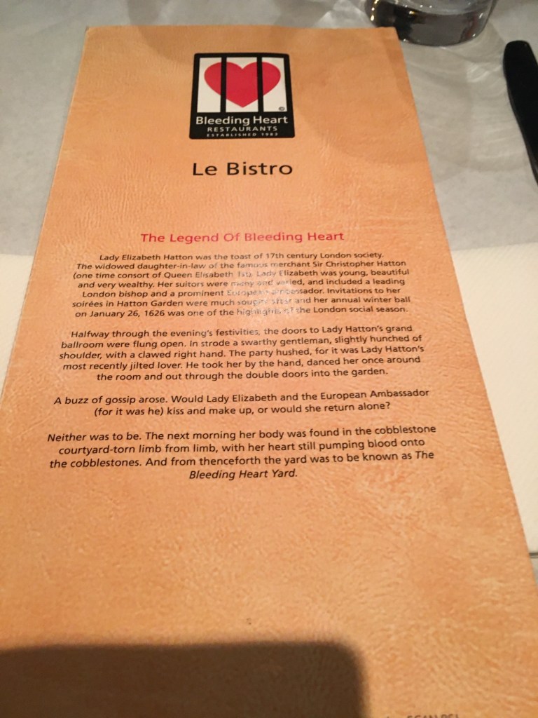 We read about the legend of Bleeding Heart where Lady Elizabeth Hatten was approached at her party by a jilted lover how essentially took her outside in the cobblestone courtyard torn from limb to limb with her heart still pumping blood on the cobblestones. And with that, Bleeding Heart was named.