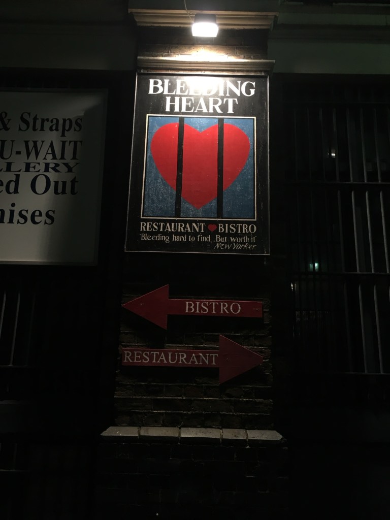 I don’t know what I dreamt about but got into a very deep sleep indeed. Woken quickly by Matthew with only a 5-10 min warning which is perfectly fine because I am really not the kind of person to take a long time to get ready. So I jump to attention and ready to head out the door in less than 10 minutes. tonight we are heading back to the Bleeding Heart precinct. But this time it’s at the bistro and we were at the pub section yesterday.