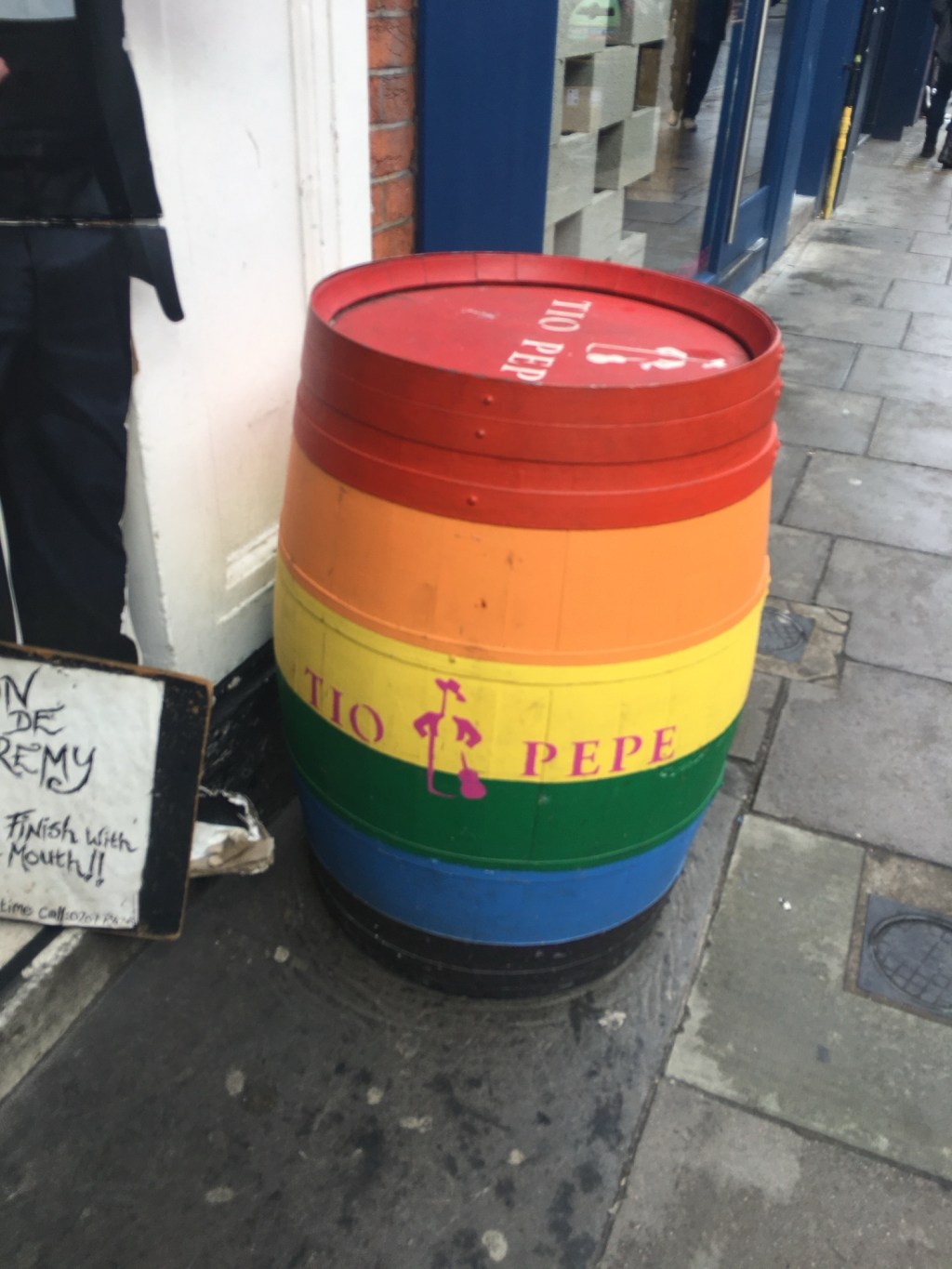As the guys finish up we thank them both with our words and but contributed a few quid to the open guitar case in front of them. We decide to head back to a pub called the Duke of Wellington, which we’d popped into for a brief drink before lunch. A very rainbow pub indeed, but super friendly. We instantly meet a number of people around us, and I guy and his partner spotted me and recognised that I was in there earlier. We exchanged a little bit of banter when I had needed to locate the bathrooms. Now he comes bounding over with partner in tow and they introduce themselves to us.